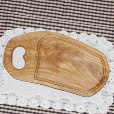 Taula rústica en fusta d'olivera amb nansa i que incorpora un canal en el seu perímetre per a recollir els líquids i sucs en tallar aliments, evitant així que es vessin i taquin la superfície de treball. Molt pràctic pel seu ús a la cuina o a la taula.