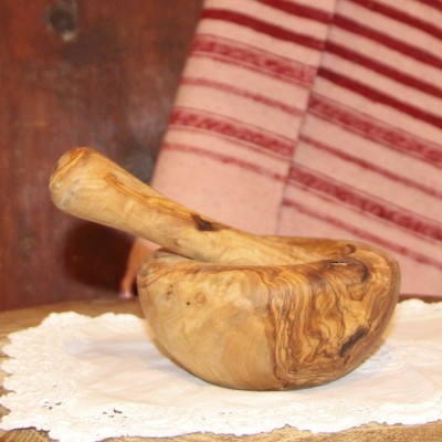 Morter amb mà de morter rústicen fusta d'olivera. Molt pràctic pel seu ús a la cuina o a la taula.