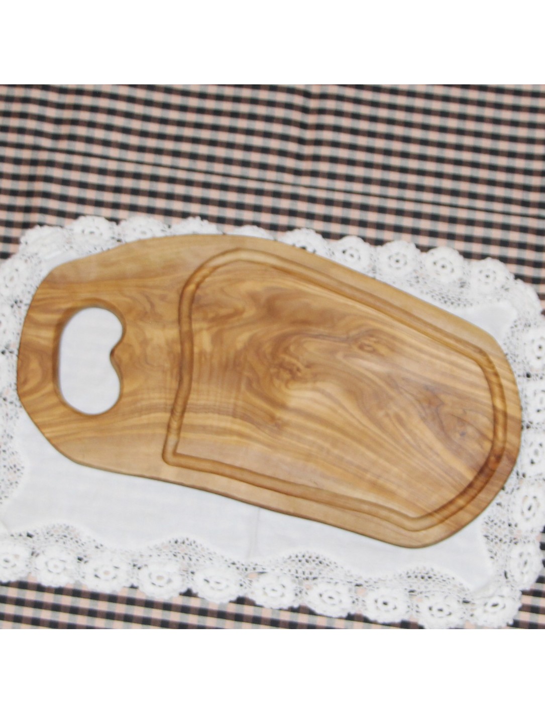 Rustic cutting board in olive wood with handle and that incorporates a channel in its perimeter to collect the liquids and juices when cutting food, thus preventing them from being seen and stained the work surface. Very practical for use in the kitchen or at the table.