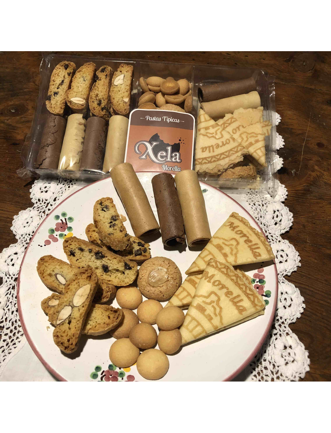 Assortment of Xel·la typical cookies, so if you don't know which one to decide on, you have them all in the same bag/box: Carquiñolis, Vanos, Barquillo, Barquillo Chocolate, Almendrados and pets de monja.