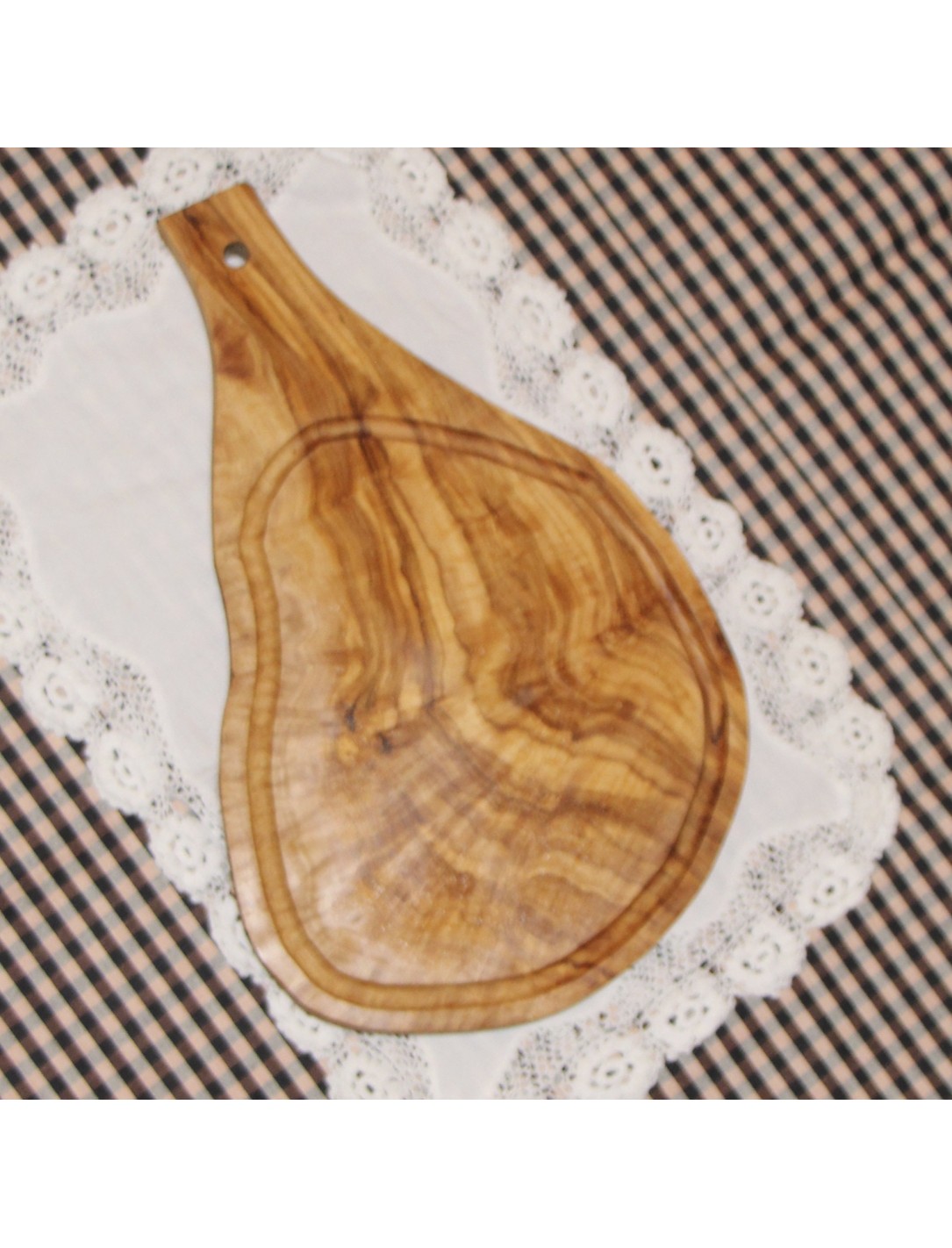 Tabla rústica en madera de olivo. Incorpora un canal en su perímetro para recoger los líquidos y zumos al cortar alimentos, evitando así que se derramen y manchen la superficie de trabajo. Muy práctico por su uso a la cocina o a la mesa.