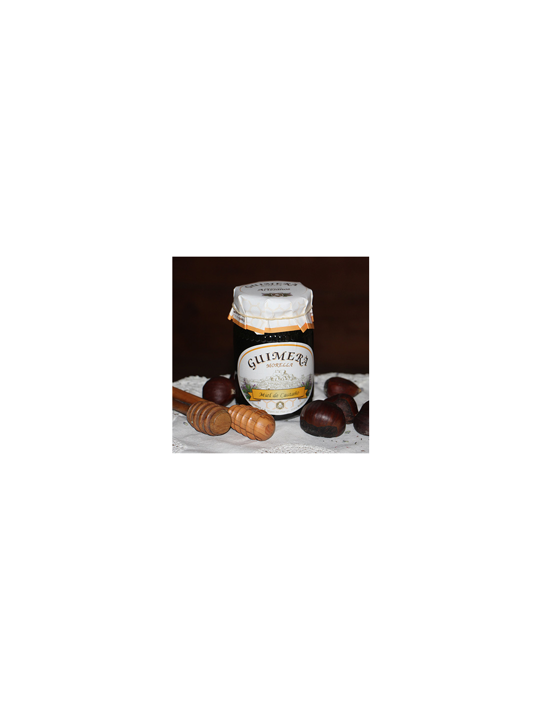 La miel de castaño es una miel oscura, de color ámbar intenso, obtenida de las flores de los castaños. Es muy apreciada por su sabor menos dulce que otras mieles, pero más intenso, con un aroma amaderado que recuerda a la madera y a las resinas de los árboles.