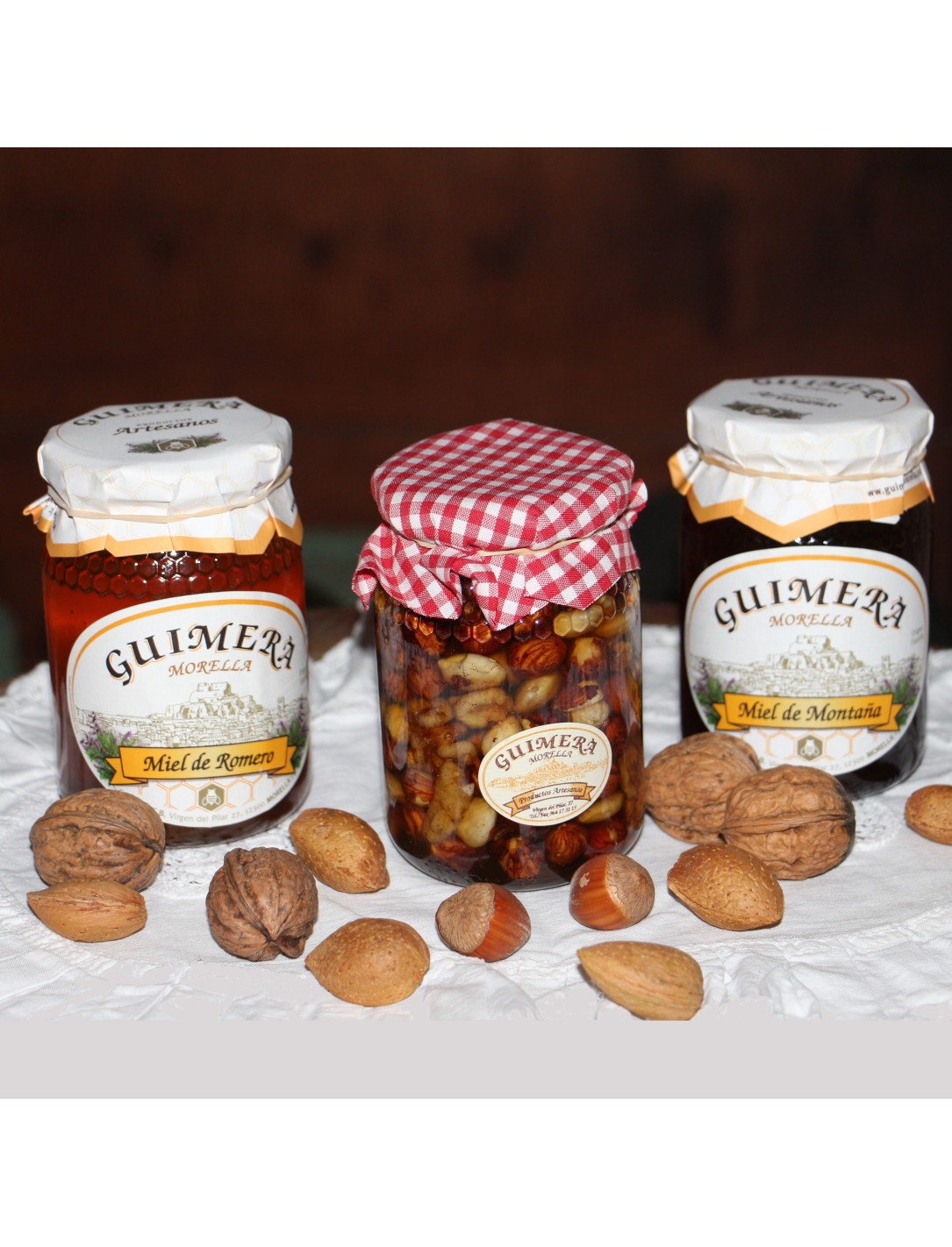 Compuesto por Miel de Azahar con Frutos Secos (almendras, avellanas y nueces), Miel de Romero y Miel de Montaña (Mil Flores).